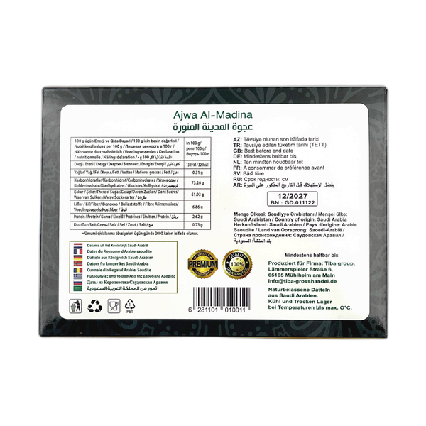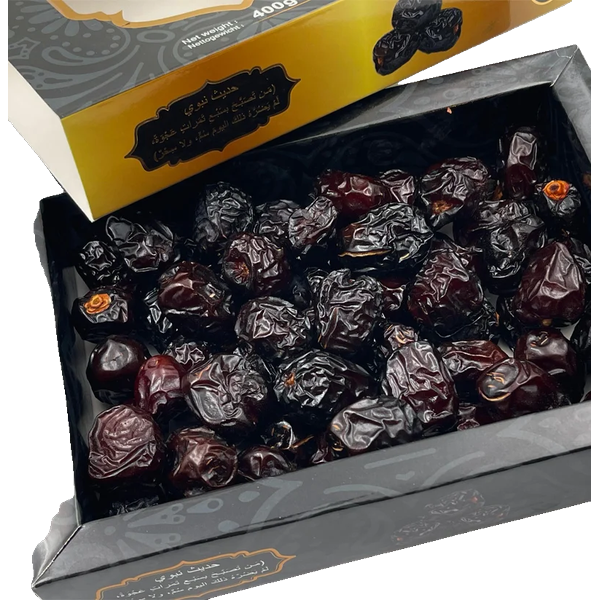 Unsere Ajwa Al-Madina Datteln 400g Jaco stammen aus der heiligen Stadt Al-Madina und zeichnen sich durch ihre außergewöhnliche Qualität, Süße und zarte Textur aus. Diese Datteln sind reich an natürlichen Nährstoffen, Ballaststoffen und Antioxidantien, die eine gesunde Ernährung unterstützen.